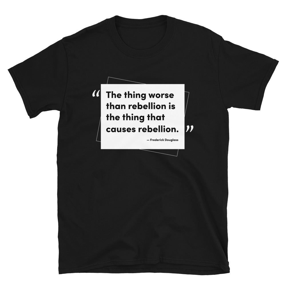 Frederick Douglass "Rebellion" quote - A December 1866 article in The Atlantic entitled "Reconstruction," abolitionist Frederick Douglass wrote, "The thing worse than rebellion is the thing that causes rebellion." This was a powerful appeal for Congress to embrace the ideals Lincoln espoused in his second inaugural address, in order to pass a civil rights amendment; giving African Americans the right to vote. Read Douglass' words here, and wear them with pride.