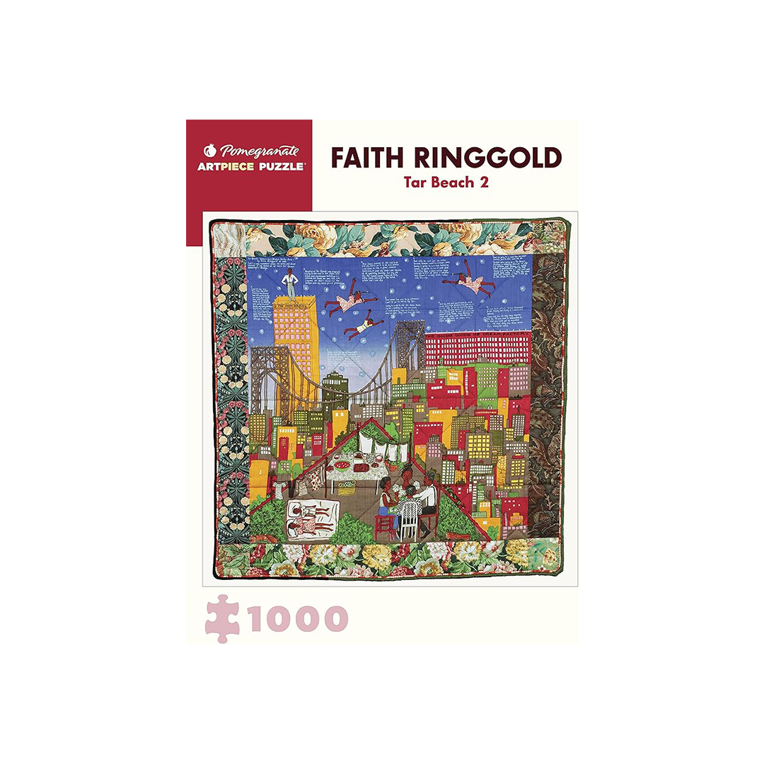 Unlock the vibrant world of Tar Beach 2 with this 1000-piece puzzle by Faith Ringgold. Assemble the stunning artwork while immersed in the story of a young girl's imagination taking flight. Perfect for puzzle lovers and art enthusiasts alike. Finished puzzle measures 25 x 25in.